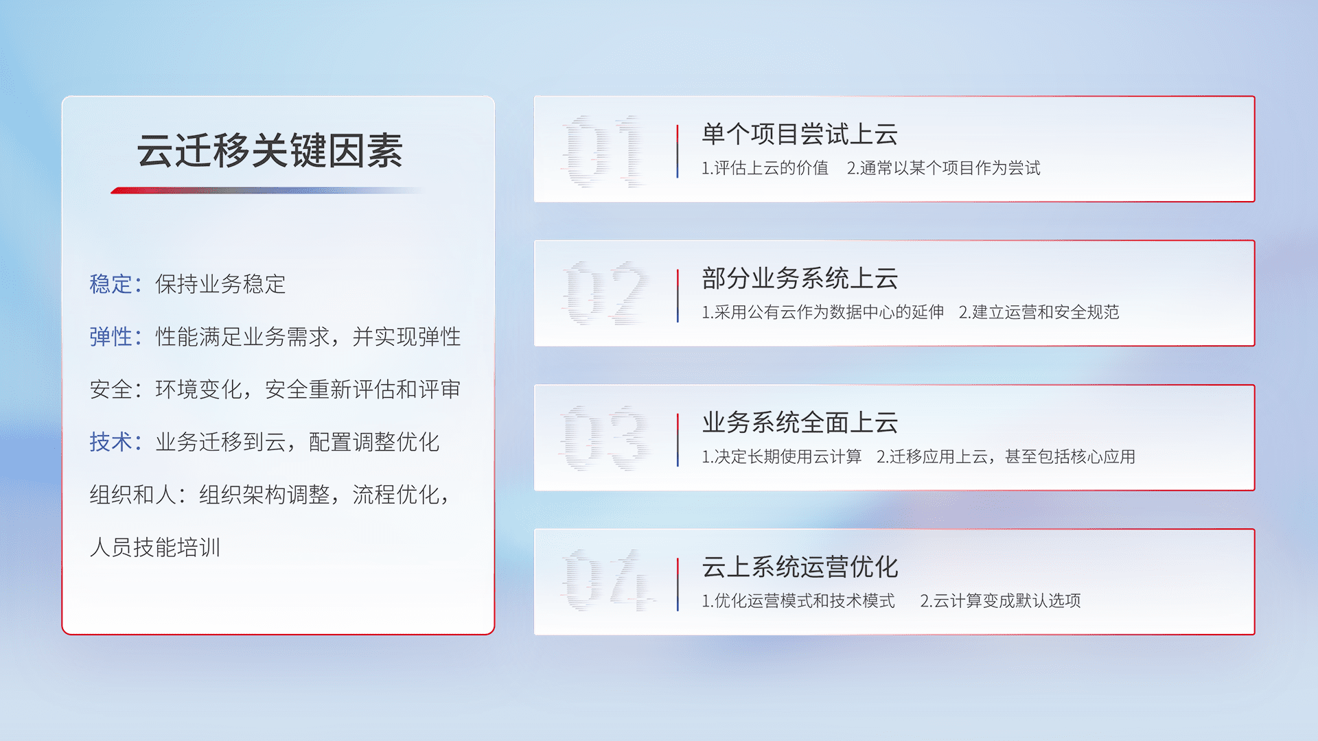 结合实际业务,,从规划设计、、、、云平台选型、、云原生改造、、、、数据迁移、、、集成交付,,,迁移全过程为客户识别最佳上云路径,,做好风险识别管理,,,,设计网络架构、、身份权限、、、、安全审计合规、、、操作审计、、日志审计、、监控告警策略、、多站点容灾设计等,,对云上基础设施进行整体规划,,提升IT治理水平,,以满足弹性、、、、高可用、、高性能的需求。。。