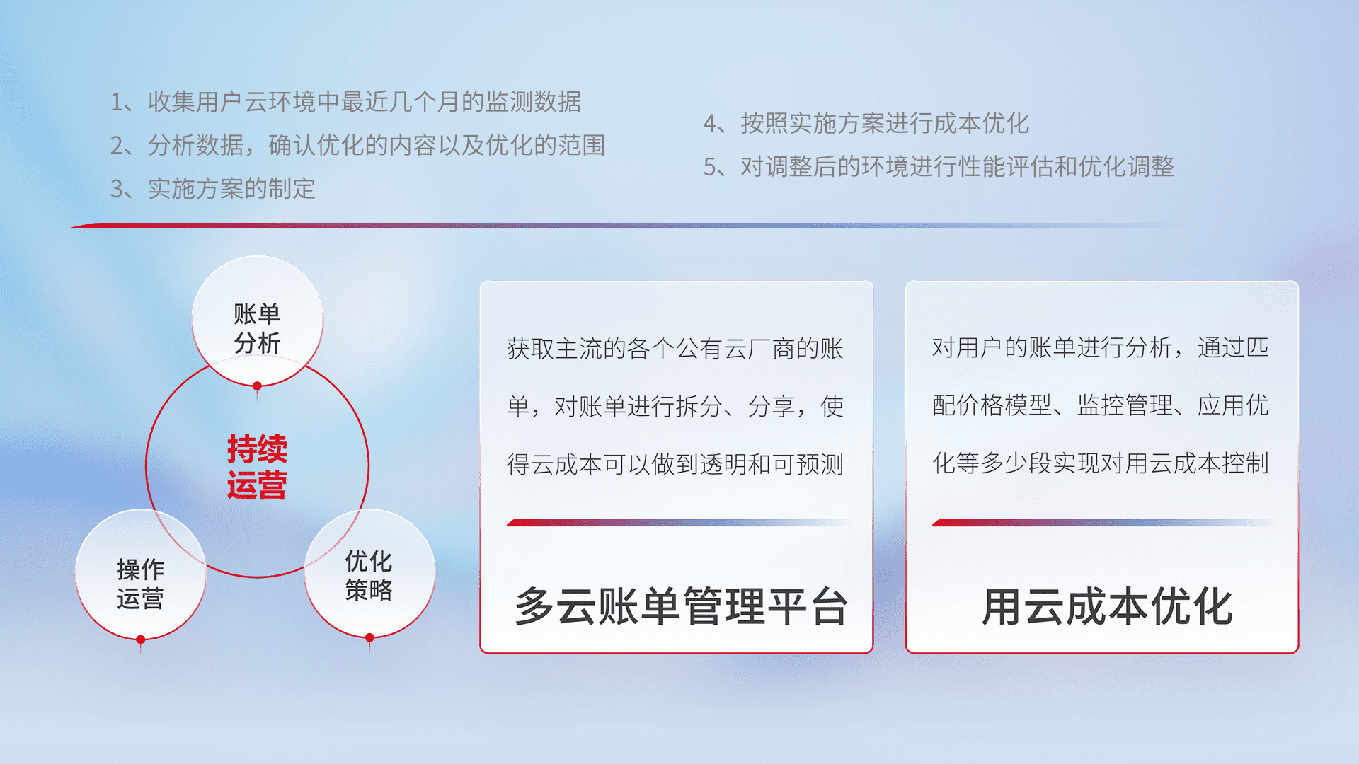 通过多云纳管,,,,以统一的资源数据模型把客户的云资源进行抽象和封装,,,进而实现对多云资源的统一操作,,,保障云资源管理的可靠性、、、、稳定性与可用性。。量身定制化运维内容,,配置、、、开发运维、、补丁管理、、备份、、监控、、、、认证和访问管理、、审计和日常巡检等,,,保障在用云过程中的可靠度,,稳定度以及高可用率。。