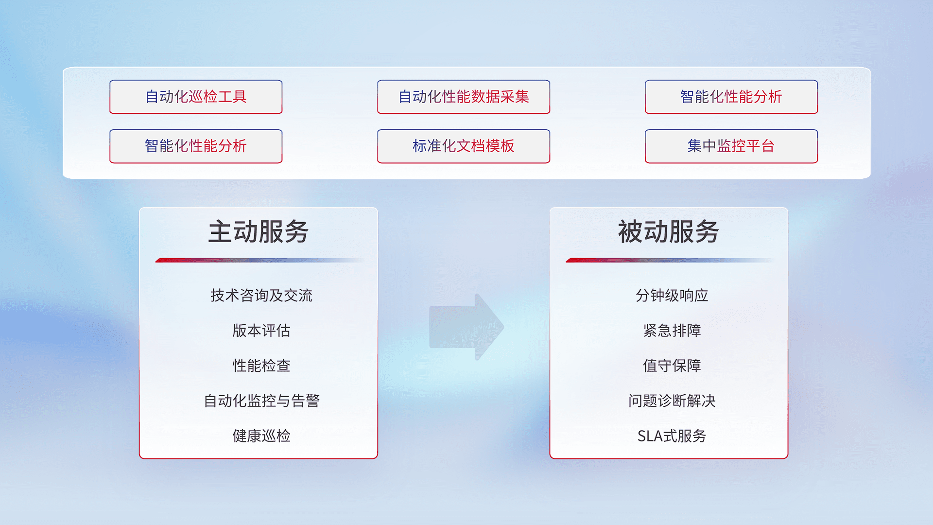 智能化工具和标准化文档,,,保障服务质量,,提供主动服务(包含技术咨询、、版本评估、、性能检查、、自动化监控与告警、、健康巡检)和被动服务包含(分钟级响应、、紧急排障、、、值守保障、、问题诊断解决、、、SLA服务)。。。